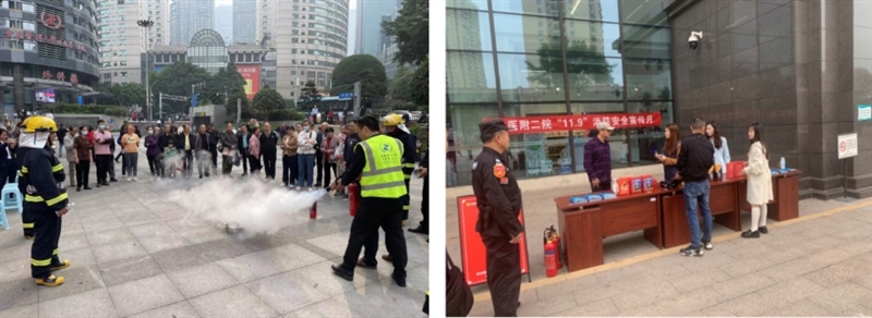 根据《重庆市卫生健康委员会办公室关于开展2023年度“119”消防宣传月活动的通知》指示、《重庆医科大学附属第二医院2023年“119”消防宣传月活动方案》精神,为提高我院职工及人民群众消防安全意识,强化消防安全“四个能力”,贯彻落实“预防为主,生命至上”这一主题,2023年11月9日,我院两院区分别组织开展了“119”消防安全月宣传活动,邓忠良副院长亲自出马站台,为本院职工及人民群众普及消防安全知识,发放消防安全知识手册,组织志愿消防队队员、微型消防站站员进行了灭火救援演练。