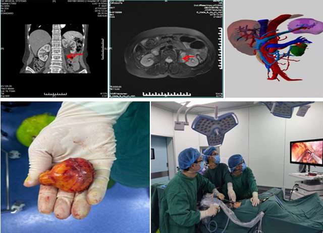 12月26日上午,这台集精准、微创、科学、安全于一体的现代化手术正式开始。腹腔镜的定位、超声刀与吸引器的相互交错,腔镜所见与前期三维重建的图像高度吻合,刘川教授根据三维重建图像所展示的肾门处密集的血管走行、肾盂输尿管和肿瘤位置,如同汽车导航,提前规划,避免绕弯路,安全快速到达,精准解剖型切除,完整剜除肿瘤,避免了肾血管及肾盂输尿管的损伤。最终手术成功,出血仅50毫升,术后患者恢复良好。