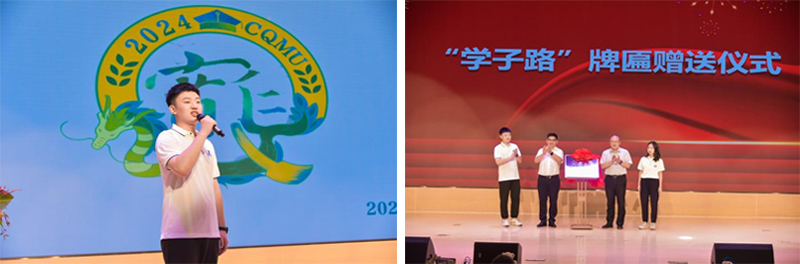 “学子路”牌匾赠送仪式上,院领导揭幕由医学影像系学生龙柳辛设计的logo,并接受了毕业生对学院饱含深情的牌匾馈赠。2024届毕业生logo整体图案传达着“不忘初心,继承衣钵,感恩前行”的祝福。