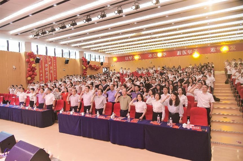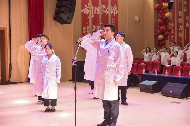 青年骨干教师代表与毕业生代表上台重温医学生誓言,台下观众也齐声宣誓,朗朗誓言坚定了医学生们“为祖国医药卫生事业的发展和人类身心健康奋斗终生!”的初心。