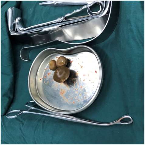 曹爷爷的这台“膀胱切开取石术”是当日的开台手术,麻醉师、主刀张唯力主任医师、一助张元峰医师、金大春医师、程量医师、麻醉医师、护士、实习生早早来到了手术室做好了准备。洗手、消毒、铺巾、穿衣、戴手套一系列操作行云流水般,先做了膀胱镜检查患者尿道的情况后,主刀医师精确地识别出解剖部位,将有膀胱手术既往史的粘连皮肤肌肉逐层切开,动作精细又温柔。手术中不可避免的切口损伤,凭借着张教授精湛的医术和爱患的精神,被降至最低。因为患者之前有开腹手术史,所以盆腔的组织粘连比较严重,这是张教授在术前就已经考虑到的困难。按照术前预计的方案,手术医师们仔细又耐心地分离了粘连组织,暴露出了膀胱。此时此刻,最紧张而又精彩的步骤来临了,张教授利落地切开了膀胱,用精巧的卵圆钳“盲夹”出了三颗圆润又光滑神似卤蛋的大结石。虽然大家之前都解读过患者的腹部平片,但是取出来的时候,在场所有人还是有些震惊和激动,张教授一直强调这是示教的好标本!