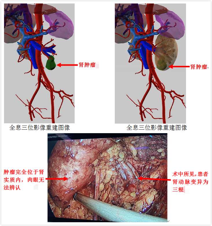刘川教授和胡自力教授通过仔细阅读患者影像学资料,发现患者肾脏肿瘤是一个内生型的肿瘤,而且位于肾脏的核心部位——肾门部。该部位实施保留肾脏的肿瘤剜除术难度极高,稍有不慎有可能损伤血管造成大出血,或破坏肾脏集合系统,造成尿液外渗。内生性肿瘤从外观上看肾脏形态完全正常,无法看到其内部肿瘤,在手术时外科医生可能无法分辨肿瘤与正常组织,导致手术无从下手或手术过程中肿瘤切除不干净。此外,患者体重达190斤,过量的肾周脂肪与肾包膜严重粘连会导致肾肿瘤边界不清、暴露困难,粘连严重的脂肪组织血供丰富,容易发生出血,增加了手术难度。CTA提示患者肾动脉血管变异较大,有三支动脉供血且三支肾动脉包绕肾静脉,无疑又增加了手术难度。