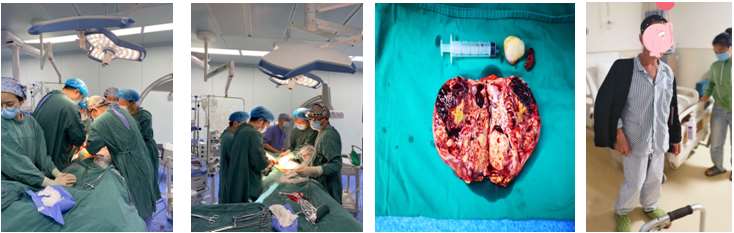 3月25日上午9时,姜庆主任负责协调指挥,由肝胆外科刘作金教授、血管外科唐博教授、泌尿科梁培禾教授、陈渝龙博士四人进行了多学科协作杂交手术,首先放置了下腔静脉滤器防止癌栓脱落风险,随后进入腹腔,医生们沉着应对,仔细分离,手术室内气氛安静严肃,时间在一分一秒地过去,终于,巨大的右肾肿瘤和腔静脉癌栓被完整切除取出,至下腔静脉完成重建重新开放,血流阻断时间仅20分钟,手术顺利完成了。术中患者一直平稳,没有输血,手术结束时,查血红蛋白还有110g/L。