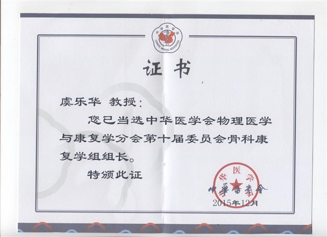 2015年12月,重庆医科大学附属第二医院康复医学科主任、主任医师、博士生导师、宽仁康复医院副院长虞乐华教授当选中华医学会物理医学与康复学分会骨科康复学组组长。