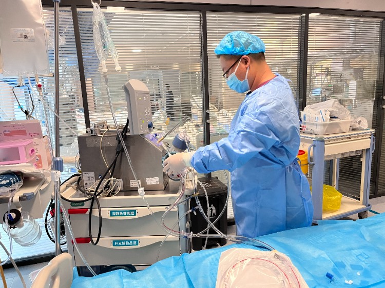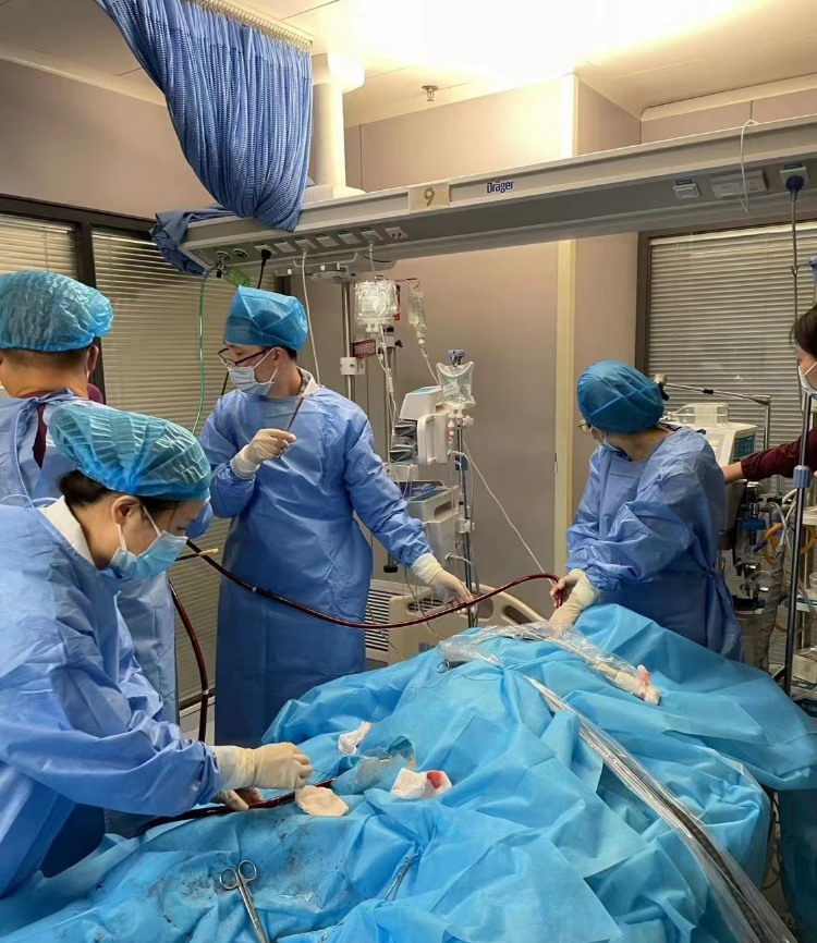 穿刺置管,预冲管路,监测生命体征……救治现场紧张有序,环环相扣。16:00,ECMO团队成功完成ECMO上机。随着ECMO的顺利启动运转,患者体内血液被引出,经过人工膜肺氧合后变为鲜红的血液再输回身体,指脉氧明显改善,生命得以维系。