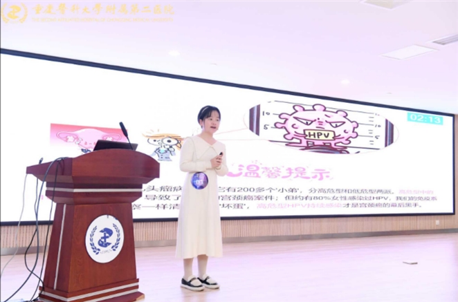 “报告报告!发现HPV病毒正在攻击宫颈,宫颈‘城墙’马上失守,紧急求助!”当天活动现场,首位出场的重医附二院妇产科青年医师涂道月一开口便引发了全场的目光。科普讲解中,她通过漫画展示,生动地为大家科普了HPV感染与宫颈癌的关系,并现场为大家科普如何抵御“HPV菌”的伤害,解除“颈”报,生动有趣的科普让台下关注直呼“学到了”。