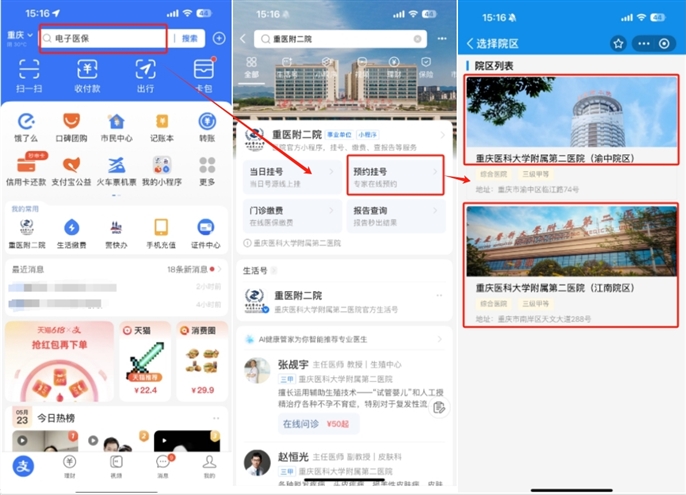 01、支付宝搜【重医附二院】小程序。选择预约挂号并选择院区