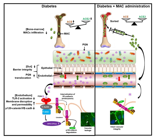 2019年10月15日,其在Circulation Research(IF=15.862)发表题为“Bone Marrow-Derived Cells Restore Functional Integrity of the Gut Epithelial and Vascular Barriers in a Model of Diabetes and ACE2 Deficiency”的研究论文,该研究首次报道从小肠中分离的有促血管生成作用的骨髓衍生前体细胞(Myeloid Angiogenic Cells)对肠道粘膜的重要保护作用。该文更进一步揭示了糖尿病小鼠中Myeloid Angiogenic Cells的缺乏导致肠道血管及内皮屏障的受损,进而使肠道菌群病原体相关性分子peptidoglycan进入循环,最终通过TLR-2介导的MyD88-ARNO-ARF6信号通路致视网膜微血管损伤。