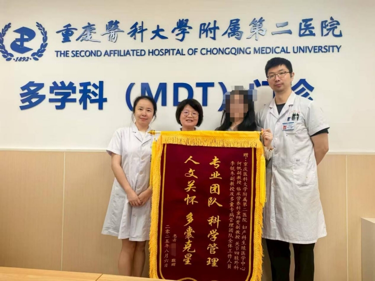 8月8日下午,陈女士专程送来这面锦旗:“专业团队、科学管理、人文关怀、多囊克星”的文字表达出她内心诚挚谢意,感谢重医附二院妇产科生殖医学中心何帆副教授、临床营养科童师雯副教授、关节四肢外科李锐冬副教授以及多囊卵巢综合征专病管理团队全体工作人员的悉心指导与管理。