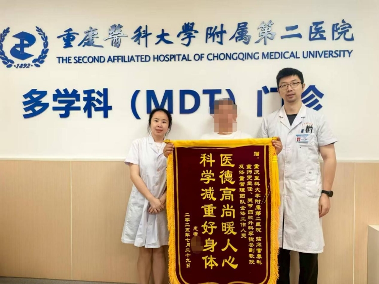 减重成功后,他将一面印有“医德高尚暖人心,科学减重好身体”的锦旗送至重医附二院,衷心感谢临床营养科童师雯副教授、关节四肢外科李锐冬副教授及体重管理团队全体工作人员的悉心指导与全程管理。
