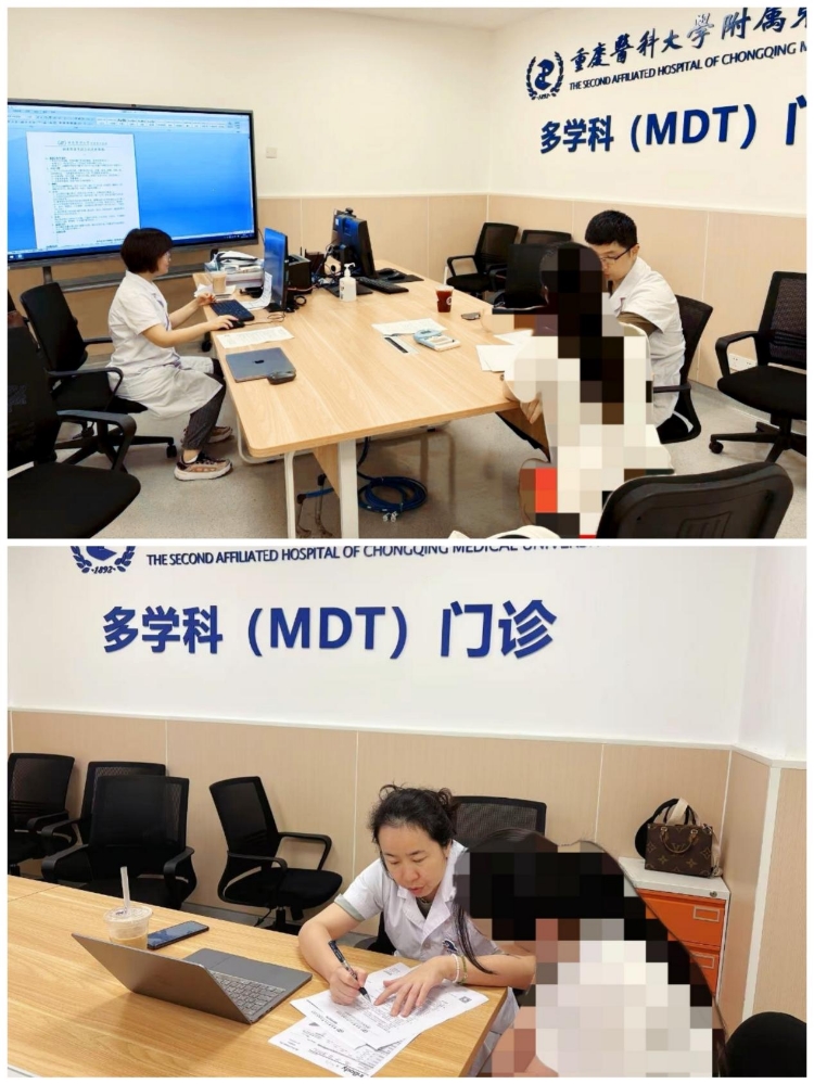 妇产科生殖医学中心何帆副教授、临床营养科童师雯副教授以及关节四肢外科李锐冬副教授为陈女士进行线下MDT会诊。图源 重医附二院