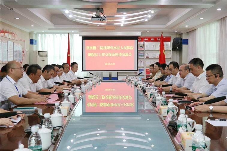 2024年7月31日上午,重庆医科大学附属第二医院——四川省邻水县人民医院医联体交流座谈会暨挂职副院长工作交接会在邻水县人民医院举行。重庆医科大学附属第二医院院长何大维、院办黄毅主任、医务处于圣杰副处长、研究生处周世骥副处长、感染病科蔡大川主任,邻水县县委常委、宣传部部长胡斌韬、县卫健局党组副书记陈晓刚、医政股负责人李章鹏及邻水分院领导班子参加了本次活动。