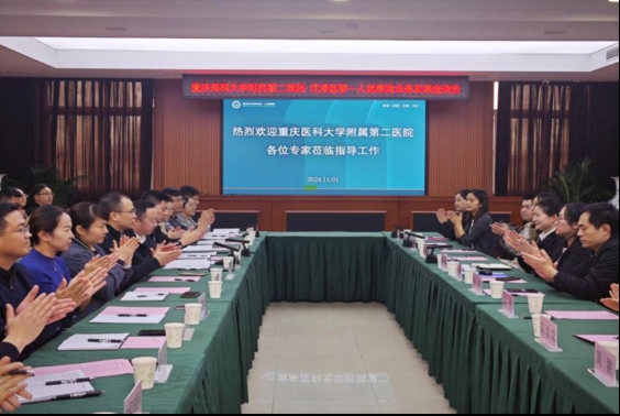 2024年11月1日,我院与江津区第一人民医院签署深度合作协议,双方将进一步加强合作,促进分级诊疗,有效实现优质医疗资源下沉,提升基层医院专科诊疗水平和整体服务能力,让广大基层群众在“家门口”就能享受到优质的医疗服务。当天上午,对外办组织妇产科主任医师华媛媛、脊柱外科主任医师汤宇、胃肠外科副主任医师夏泊宁、眼科副主任医师周宇、呼吸内科副主任医师赵燕、泌尿外科博士陈渝龙、重症医学科博士周游、康复医学科博士罗亚茜、门诊办主任朱悫等专家团队一行11人赴江津区第一人民医院开展健康义诊、教学查房、指导交流活动。