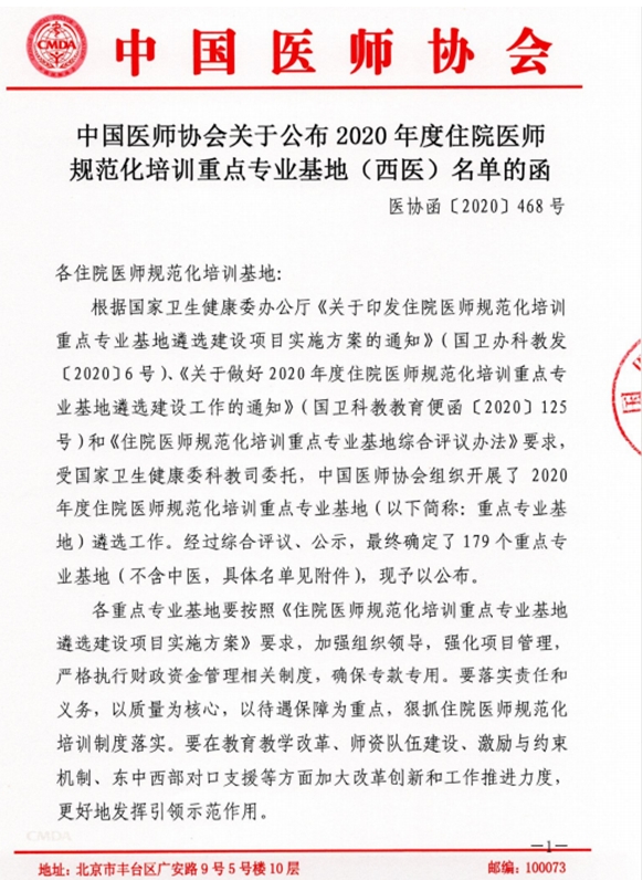近日,中国医师协会组织开展了2020年度住院医师规范化培训重点专业基地遴选工作,经过综合评议、公示,最终确定了26个全科重点专业基地,其中我院全科住院医师规范化培训专业基地成功入选,也是重庆市唯一入选医院。