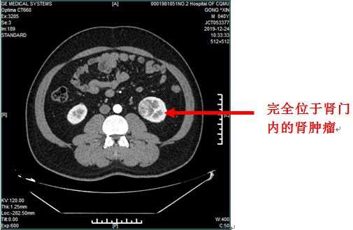 刘川教授和胡自力教授通过仔细阅读患者影像学资料,发现患者肾脏肿瘤是一个内生型的肿瘤,而且位于肾脏的核心部位——肾门部。