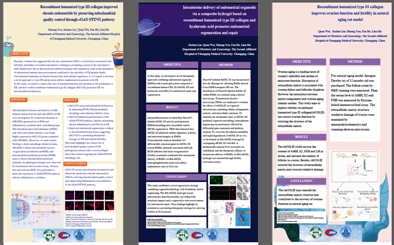 重庆医科大学附属第二医院妇产科胡丽娜教授研究团队4项前沿原创性研究成果在国际舞台上闪耀登场,展示了该学科在妇产生殖领域的科研实力和国际影响力。“十年磨一剑”,研究团队与中科院生物物理研究所、复旦大学、四川大学和锦波生物合作,潜心于中国原创新型生物材料-重组人源化胶原蛋白与慢性生殖相关疾病的基础及临床研究已有10余年,在此次大会中分享团队最新研究成果。