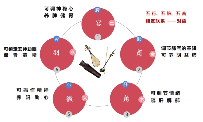 五行体系:依据“角、徵、宫、商、羽”五音,对应肝、心、脾、肺、肾五脏,以及木、火、土、金、水五行。通过特定音乐频率,调理相应脏腑气机平衡,实现“乐则气通,音则意和”的调理效果。