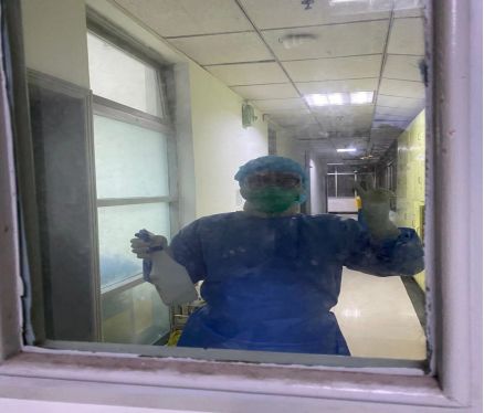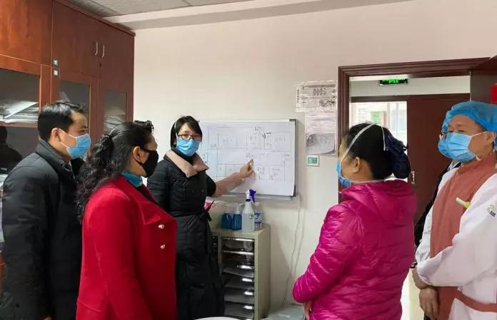 发热病房戢芳护士长向保洁人员培训模拟发热病房的工作环境