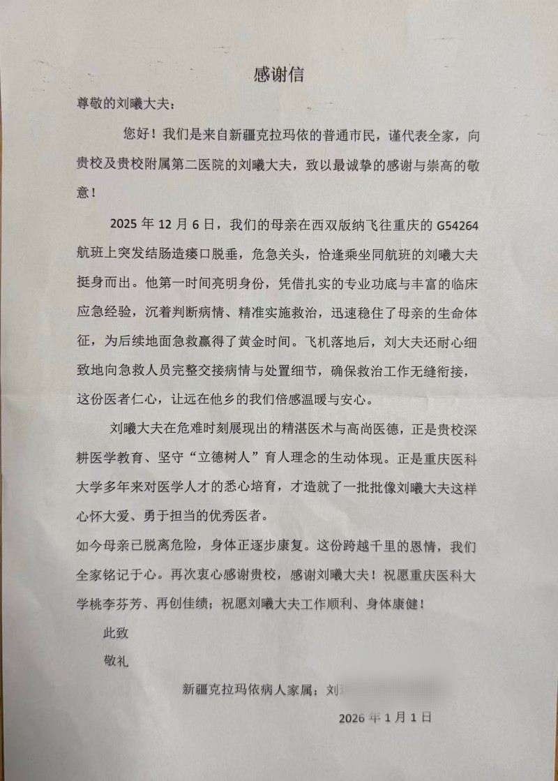 2025年12月6日,西双版纳飞往重庆的G54264航班上,刘女士的母亲突发造瘘口结肠脱出体外,危急时刻,搭乘该航班的重医附二院刘曦副教授挺身而出。面对有限的机舱急救条件,他沉着冷静地运用专业知识处置,迅速为患者稳定病情,为后续治疗抢占了黄金时间。
