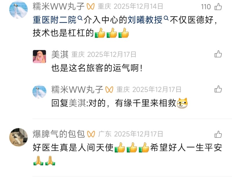 刘曦在飞机上勇救患者的事迹也得到中央电视台、人民日报客户端、重庆日报客户端、上游新闻客户端等媒体关注和报道,全国媒体广泛转载,数百万网友纷纷为刘曦的医者担当与专业素养点赞:“重医附二院介入中心的刘曦教授不仅医德好,技术也杠杠的”“如果社会人人都像刘教授这样有爱心、有担当,世界就会越来越美好”……这场高空救援成为全网热议的暖心话题。