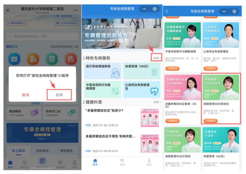 2.跳转至“渝悦全病程管理”小程序 ➡ 点击首页特色专病服务 ➡ 点击全部➡ 选择戒烟管理