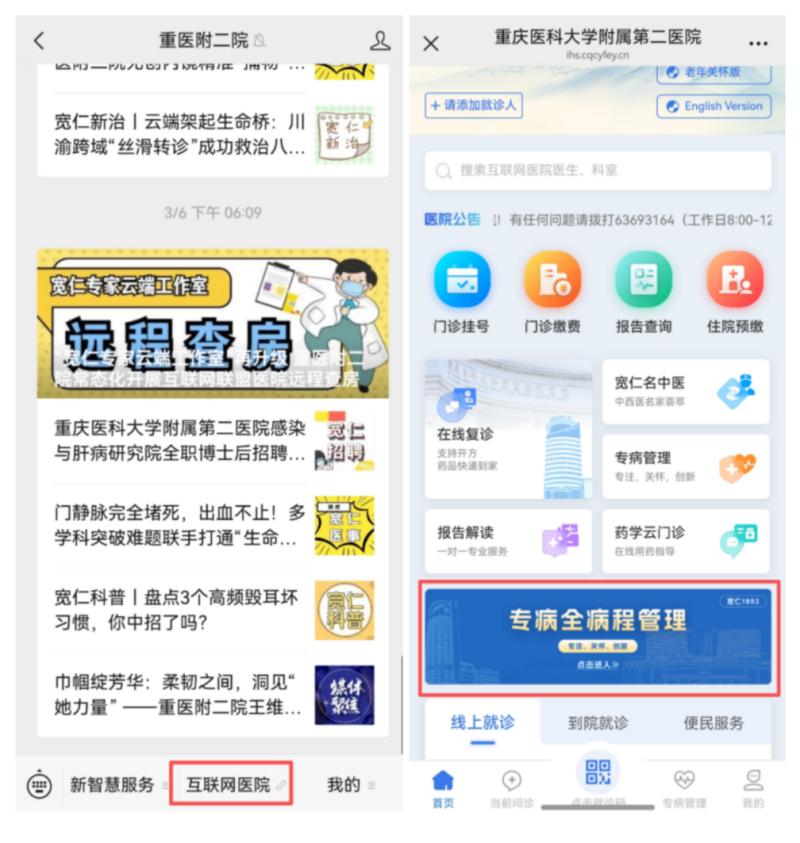 1.关注重医附二院微信公众号 ➡ 进入互联网医院首页 ➡ 点击专病全病程管理