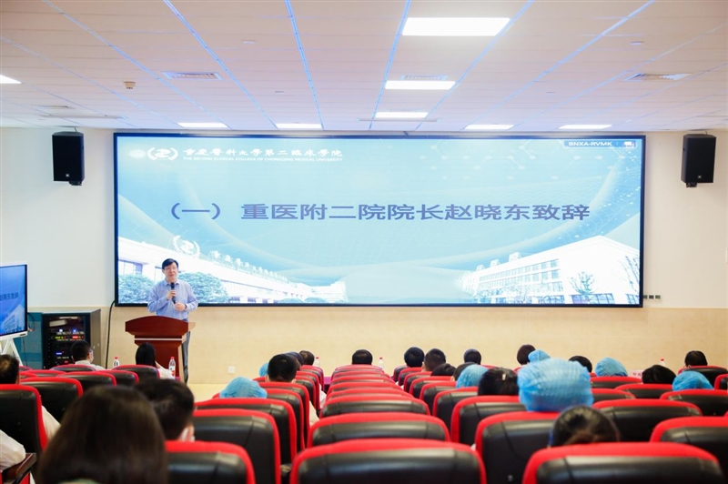 比赛开幕式由教务处副处长杨坤蓉主持,出席的嘉宾有赵晓东院长、特邀比赛顾问刘长安教授、裁判长印国兵教授、副裁判长兰箭副教授、朱悫,杜之渝副处长、阳文琳副处长、罗玲副主任、罗强副处长、宋家虎副处长、裁判团队、26个参赛队领队以及重医附三院等兄弟医院科教部门负责人等。赵晓东院长为比赛致辞,他指出比赛旨在进一步发挥附属医院医学人才培养的主体职能,深入推进医学教育综合改革,创新医学实践教学体系,打造高水平临床教师队伍,全面提升医学生综合素质和技术技能水平,祝愿各参赛团队能以医者的仁心、过硬的技术、昂扬的斗志,展示出师生团队奋发向上的时代风采。