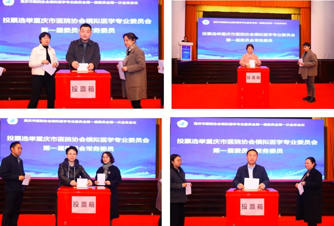 依据公平、公正、公开的原则,会议选举产生了重庆市医院协会模拟医学专业委员会第一届委员会委员、常务委员、副主任委员、主任委员。重庆医科大学附属第二医院杜宇全票当选为第一届委员会主任委员;重庆医科大学附属第一医院李曼霞、重庆医科大学附属第二医院印国兵、重庆医科大学附属儿童医院翟瑄、重庆医科大学附属永川医院黄益素、重庆医科大学附属大学城医院刘刚、陆军军医大学第一附属医院邹丽琴、陆军军医大学第二附属医院冯韬、重庆市人民医院张萌、重庆市急救医疗中心董荔、重庆医科大学妇女儿童医院罗茜、重庆大学附属三峡医院吴萍、重庆护理职业学院谢莉玲分别当选为第一届委员会副主任委员。会上宣布杜宇为专委会党小组长。