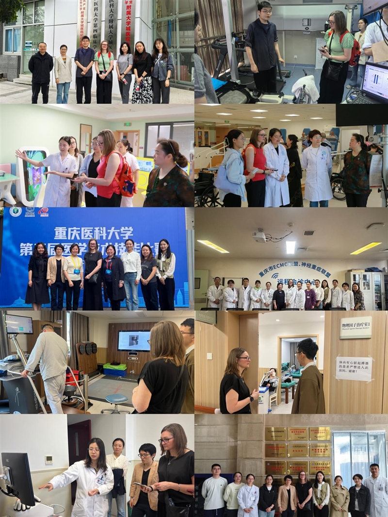 此外,莱斯特大学负责人一行在项目团队的陪同下,实地考察了教学场地,并重点参观了我校多家临床教学医院,在重庆医科大学附属第二医院,代表团深入走访了康复医学科、院史馆、临床技能培训中心、重症监护室(ICU)及脑机接口病房等重要教学与实践场所,对医院深厚的学科积淀、先进的设施设备以及融合临床与教学的完整体系留下了深刻印象。此外,代表团还先后访问了附属大学城医院、附属第一医院以及附属康复医院,全面了解了我校在康复医疗与临床教学方面的丰富资源与整体实力。