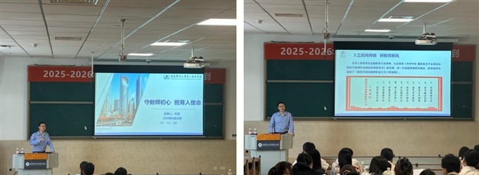 随后杜宇副处长以《守教师初心,担育人使命》为主题,从立德树人理论的提出到落实途径,为老师们讲授了新时代教师应如何培养高素质医学人才。同时,领学了《新时代高校教师职业行为十项准则》,引导新进教师立高尚师德,树教育新风。在讲到新医科背景下的医学教育创新与发展时,他从宏观出发对当下我国医学教育的发展趋势做出分析,给教师们指明了努力和前进的方向。最后杜宇副处长从每位教师的切身利益出发,详尽的解读了学校及学院教学管理核心制度,对教学的规范性提出严格要求。