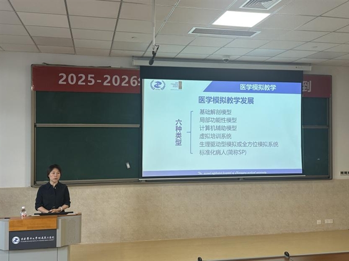 教务处临床技能中心方艳主任以《医学模拟教学与医师岗位胜任力的提升》为主题,强调了医学模拟教学的重要性,阐述了医学模拟教学与岗位胜任力的关系,并对学院临床技能中心的布局设施、人员队伍以及中心的工作运行进行了全面的介绍。在授课最后,方艳主任强调技能中心始终为教师服务,提供开展模拟教学的一切条件,欢迎广大教师与技能中心开展合作。