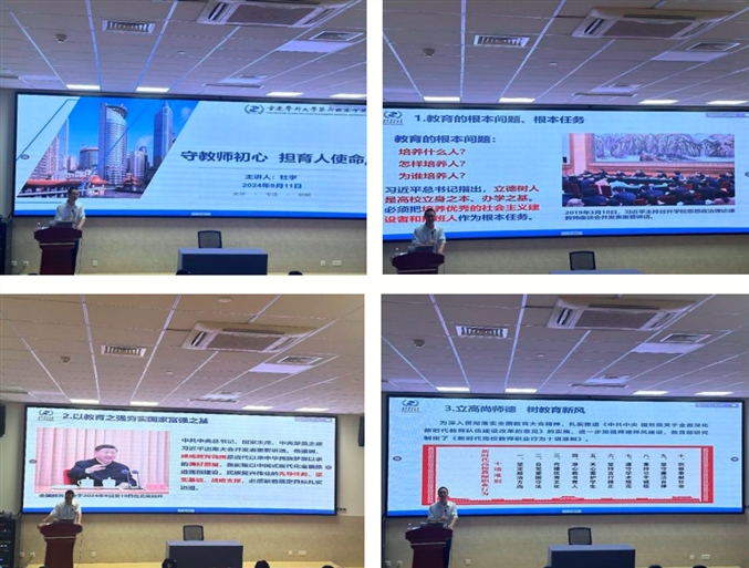 随后杜宇副处长以《守教师初心,担育人使命》为主题,结合习近平总书记近期在全国教育大会上的讲话以及教育部怀进鹏部长在庆祝第40个教师节暨全国教育系统先进集体和先进个人表彰活动中的讲话,从立德树人理论的提出到落实途径,为老师们讲授了新时代教师应如何培养高素质医学人才。领学了《新时代高校教师职业行为十项准则》,引导教师立高尚师德,树教育新风。同时,介绍了新医科背景下的医学教育创新与发展,从宏观层面对当下我国医学教育的发展趋势做出分析,给我们教师指明了努力和前进的方向。最后,从每位教师的切身利益出发,对学校和学院重要教学管理制度进行了详尽的解读。