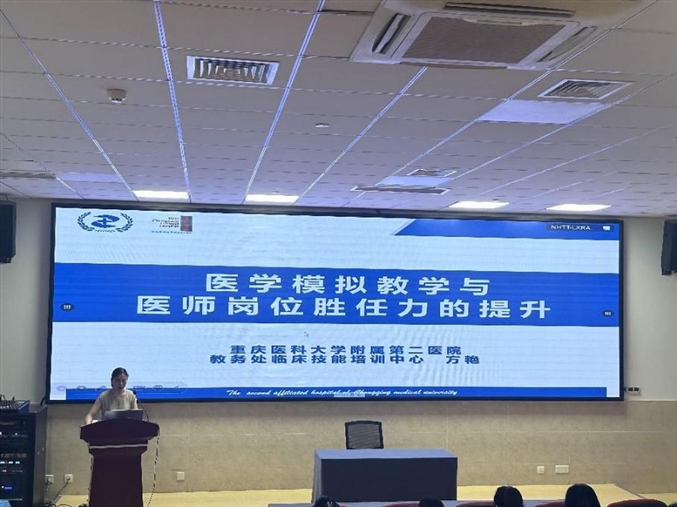 教务处临床技能培训中心方艳主任以《模拟培训教学与医师岗位胜任力的提升》为主题,强调了医学模拟教学的重要性,阐述了医学模拟教学与岗位胜任力的关系,并对学院临床技能中心的布局设施、人员队伍以及中心的工作运行进行了全面的介绍。在授课最后,方艳主任强调技能中心始终为教师服务,提供开展模拟教学的一切条件,欢迎广大教师与技能中心开展合作。