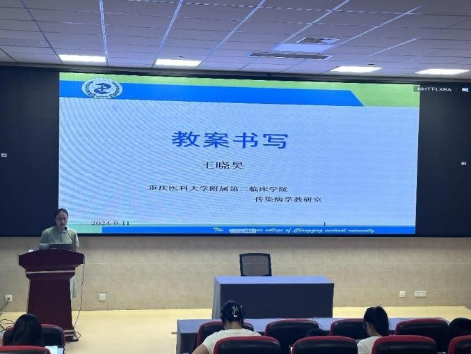 学院青年教师代表,传染病学教研室王晓昊老师总结多年授课及教学竞赛经验,进行了《教案书写》的讲解。她强调教案直接关系到教学效果的优劣,是上好一堂课的前提条件,在成为教师后就必须开始充分重视编写教案,做好扎实的教学工作。