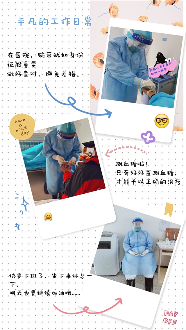 她说:“穿上那一身防护服,每天按时为叔叔、阿姨们监测血糖、我轻手轻脚的操作着生怕把他们扎疼了,怕他们疼又不好意思跟我说,可是虽然隔着口罩我却能感觉到他们眼神里对我的信任,我感觉自己又多了一份责任和信心。”