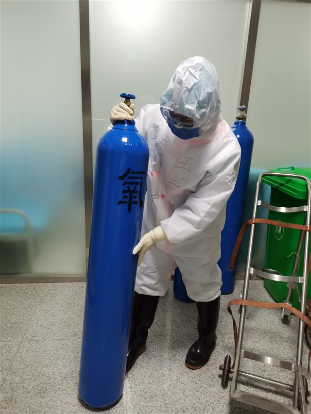 穿着厚厚的隔离衣,戴着4、5层医用手套。她熟练的操作着,将重达60公斤的氧气瓶搬上架子,再用推车将氧气瓶快速而又平稳的推去病房。一刻也不能停息,一刻也不敢松懈,我们的每一个动作,都关乎着患者的生死。