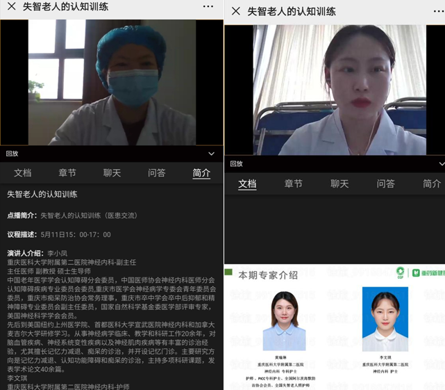 在痴呆的防治宣传活动中,痴呆患者也逐渐得到了社会的关注,患者及家属对认知的康复也更加重视,李文琪护师就失智老人的认知训练为主题,讲解了痴呆患者生活中出现的问题及详细的认知康复训练方法,虽然是线上的活动,但患者及家属的热情并未衰减。之后李小凤副主任和黄瑜琳护师就痴呆患者的治疗方案及药物指导等问题与患者进行了互动沟通,解答了患者的疑问。线上直播气氛非常热烈。