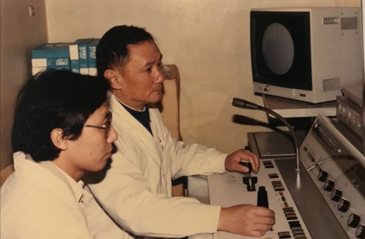 (1986年新安装的胃肠摇蓝机开始工作,图为李鼎寰教授和他的关门弟子周伟生)