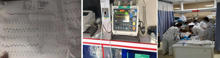 10:15分,急救部许珊医师赶赴现场,患者已出现意识丧失、心室颤动、心源性休克等症状,医护人员立即给予患者气管插管、心肺复苏及电除颤治疗,但反复除颤及予抗心律失常药物后患者生命体征仍极不稳定,每次电除颤后正常心跳仅仅能短暂维持数分钟,患者自主意识也未能恢复。