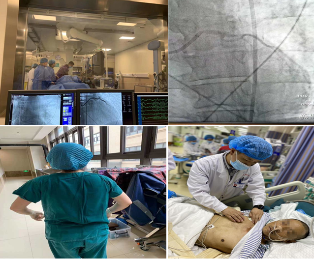 此时能挽救患者生命的唯一办法就是开通患者堵塞的冠状动脉,但当地医院无急诊溶栓及PCI条件,且患者无法维持稳定的生命体征,转院的风险极大,更为严峻的是,患者为外来务工人员,家属不在身旁,无法进行沟通签字,许珊医生陷入两难抉择。紧急关头,许医生致电回院,请求心内科及急救部上级医师、院值班协助,经紧密讨论后众专家一致认为:患者急性前壁心肌梗死诊断明确,且已经严重威胁患者生命,虽然风险极大,但作为西南地区的高水平医疗中心,我院医务人员决定放手一搏,将患者送回医院进行急诊PCI手术。接到讯令后,凌智瑜副主任指示:迅速联系激活导管室,通知心内科陈国柱副主任医师及陈伟杰主治医师火速赶到医院准备手术。