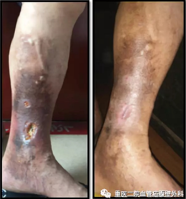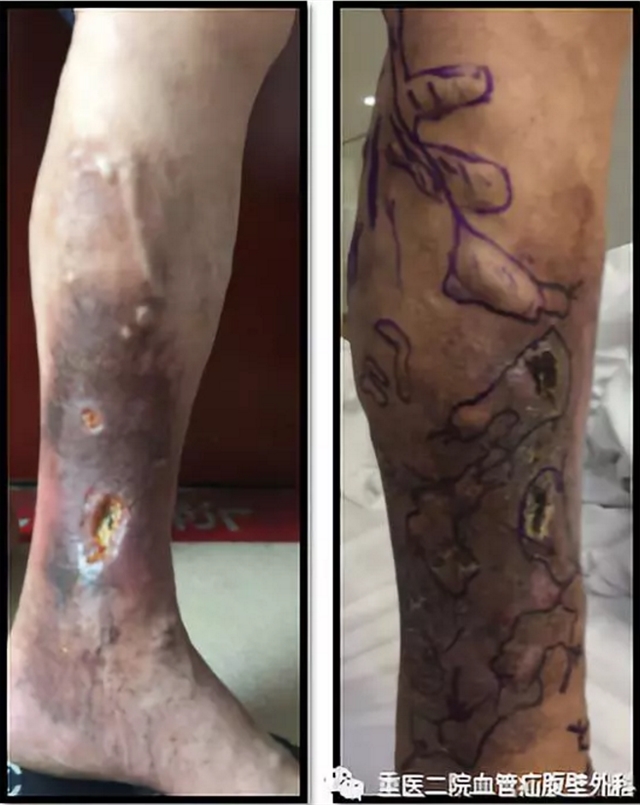 老烂腿:从最初静脉在皮肤表面曲张、逐步拉长增粗,至严重扭曲,直到下肢出现很大静脉曲张团块、湿疹样瘙痒、色素沉着或者溃疡,反复发作,难以愈合。