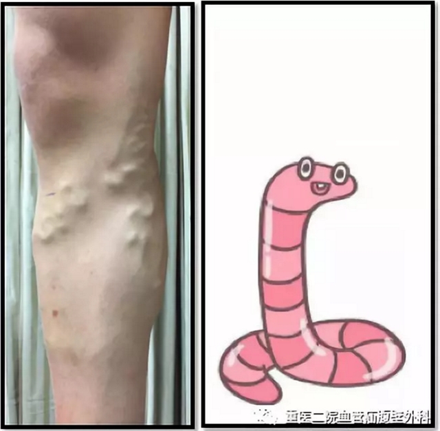 蚯蚓腿——是下肢静脉曲张的俗称,因为曲张的静脉血管像一条条蚯蚓,故称蚯蚓腿。