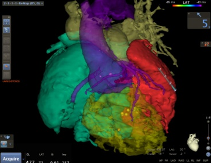 作为重庆市心律失常质控中心,我院心血管内科在室上速的识别和消融方面驾轻就熟,但对于患者而言却充满挑战。首先,复杂的先天畸形,加之外科矫形使得患者心脏解剖结构显著改变,常用的定位标志缺失;其次,复杂的结构改变可能导致电生理特性发生变化,增加心动过速鉴别和消融的难度;最后,单心室畸形合并室上速的病例在全球范围内鲜有报道,缺乏经验总结。殷跃辉主任指出,熟悉心脏的解剖结构是所有心律失常成功消融的关键。因此,特意安排患者完善了心脏CT以重建出心脏的3D模型,术中将CT图像与构建的电图进行融合,可以精确反应心脏的结构特征。