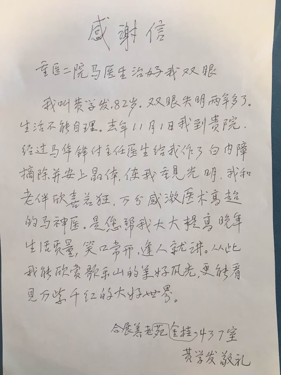 义诊正在进行中出现了更为动人的一幕,一年前在重医二院由马教授主刀的白内障手术的黄爷爷找来了,双手紧握马教授的手说:“马神医,谢谢你,你给我做了白内障手术之后我又能重新欣赏到歌乐山的美好风景,看到我的老伴儿和家人,都是因为你和附二院眼科的医护人员医术高超,仁心仁德啊!”紧接着黄爷爷将亲笔写给马教授的感谢信小心翼翼的交到马教授手中,眼中的感激之情溢于言表。