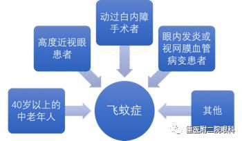 飞蚊症常发生于40岁以上的中老年人,高度近视眼患者,以及动过白内障手术者,其他如眼内发炎或视网膜血管病变患者,也会形成此病。