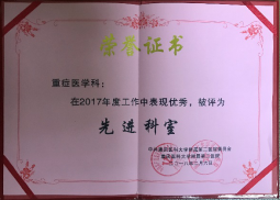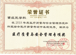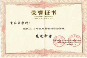 2010、2011、2012、2013、2018年“医疗质量安全管理奖”;2015、2018年“先进科室”;3. 2016、2017”合理用药优秀奖”;4.2017年“三基三严”大练兵、大比武三等奖;2017年三全护理示范护士站,2018年护士规范化培训学员OSCE技能大赛团体一等奖;4.2019年 “医疗质量与安全管理先进科室”。