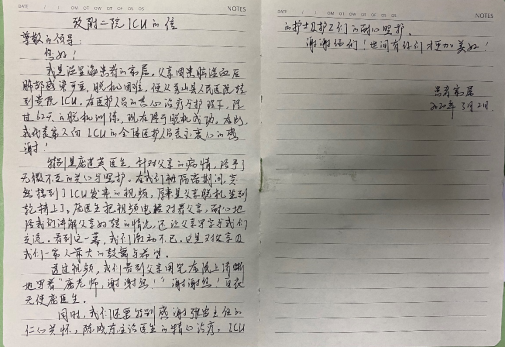 “ICU绝不是冷冰冰的,而是温暖体贴、充满希望的,谢谢你们,世间有你们才更加美好”一封带着浓浓爱意的感谢信里,传达着对重医附二院ICU的炙热感情,书写着病房里的不为人知的温暖点滴,写信人正是疫情期间入院治疗的温先生。