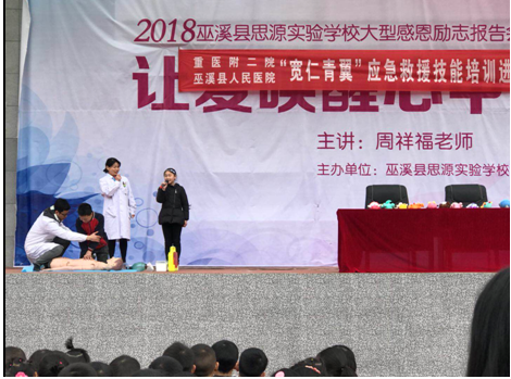 为弘扬雷锋精神,宣传普及急救技能,2018年3月7日上午,重庆医科大学附属第二医院巫溪分院的医护人员开展了“人人学急救,生命更长久”主题活动,利用专业知识为巫溪县思源实验中学的九百多名师生进行了心肺复苏、溺水急救、气道梗阻急救、狗咬伤等急救技能的现场培训。