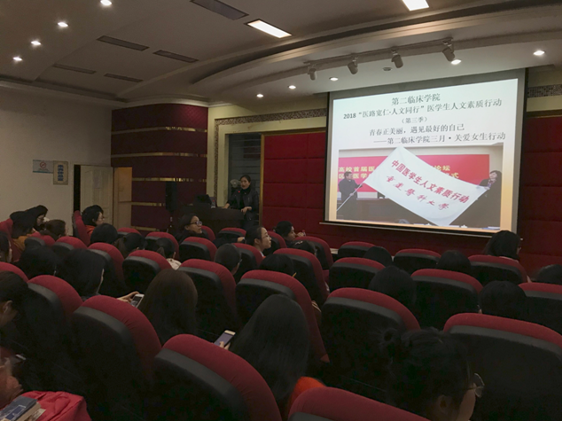 三月风情陌上花,早春三月,温柔而恬淡,注定是属于女生的美好的时节,为此,我们“医路宽仁·人文同行”医学生人文素质教育系列活动(第三季)在这春意朦胧的三月开展了关爱女生活动,邀请了医院妇产科专家胡丽娜教授给女生们带来了关爱女生生殖健康知识讲座,旨在让超过学生总数60%的这个群体关注自身身心健康,遇见最好的自己,让青春更美丽。讲座于3月19日下午3点在医院多功能厅准时开始,整个会场座无虚席。