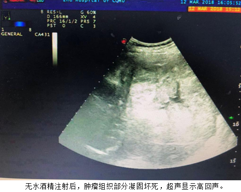 2018年3月13日,肿瘤中心蒋萱主治医师在超声引导下成功行经皮肝癌瘤内注射无水酒精1例。
